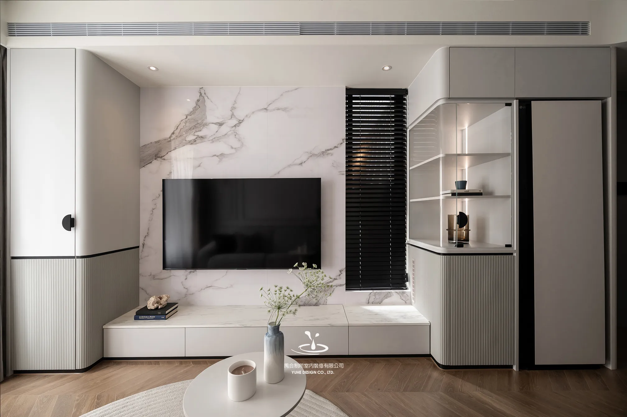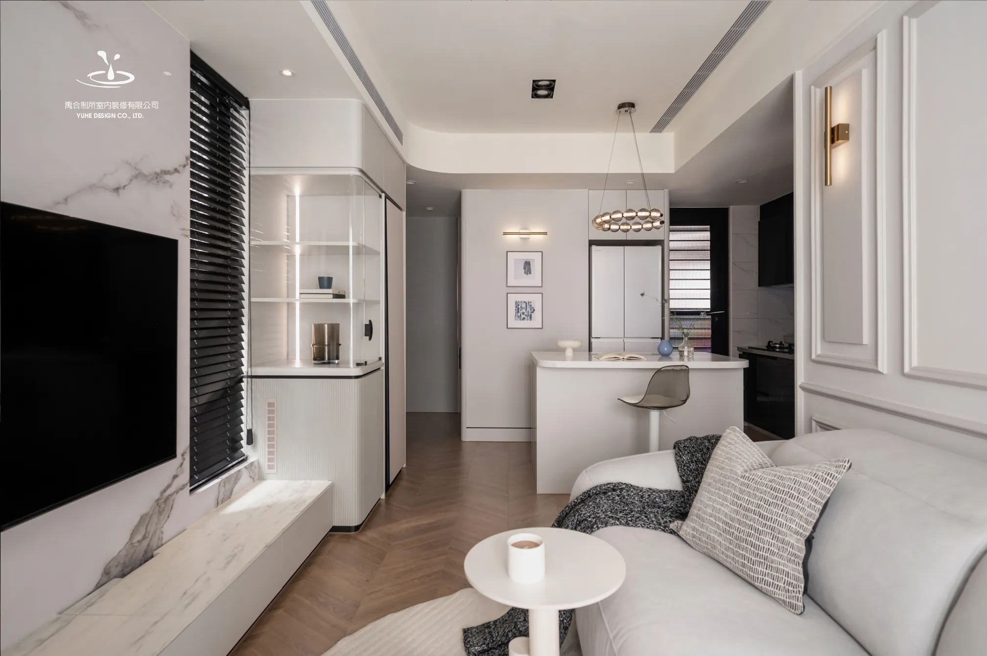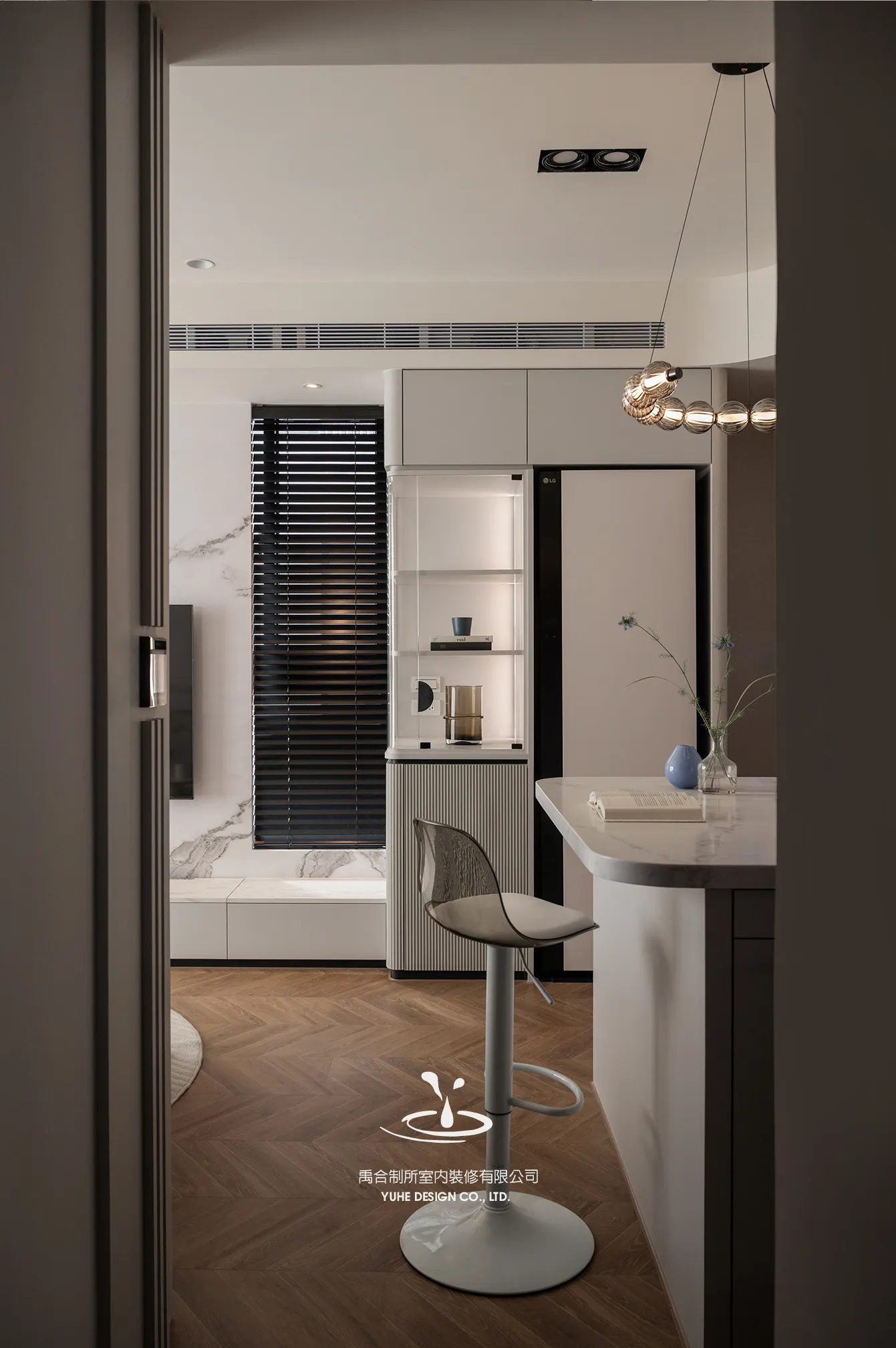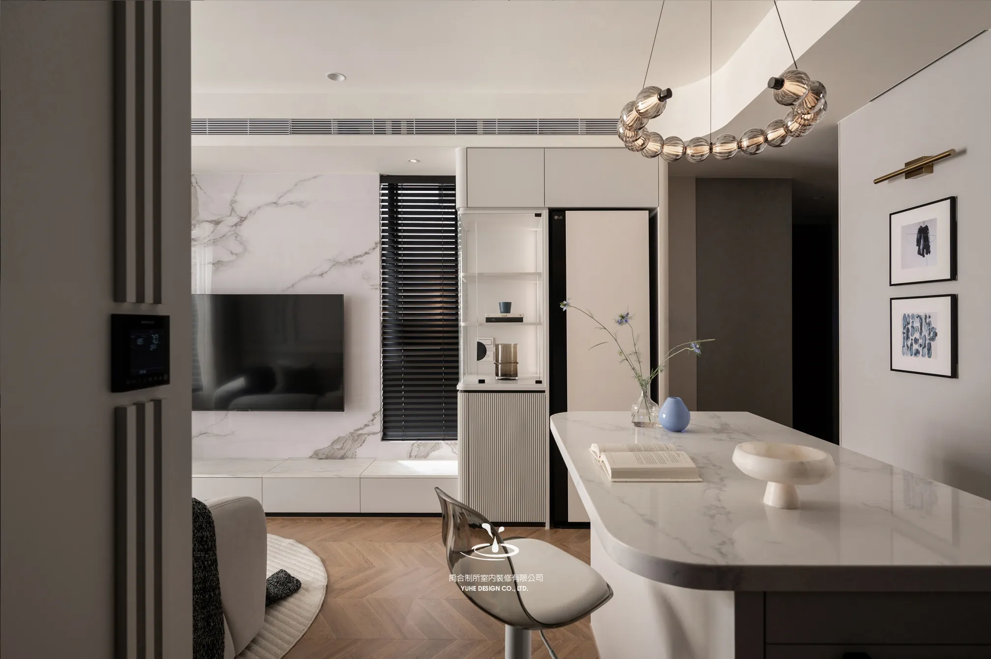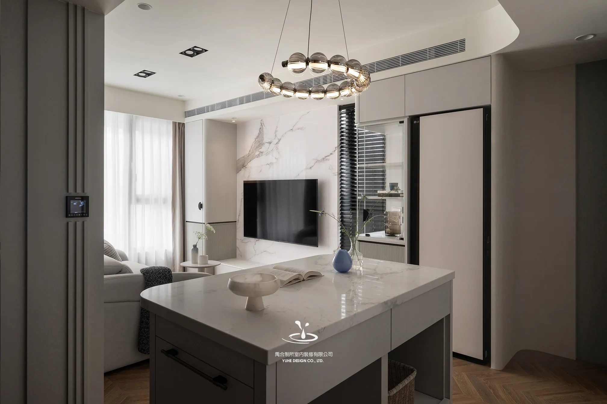 很多人以為小坪數只能將就, 其實只要比例抓對, 生活就會變得很舒服。 用石紋延伸電視牆的視覺軸線, 弧形櫃體收起銳利邊角, 格柵與玻璃展示櫃讓光有層次地停留。 中島結合餐桌, 讓生活不被空間切割, 而是自然流動。 - 你們家會想要中島結合餐桌嗎? 一起來聊聊吧💕